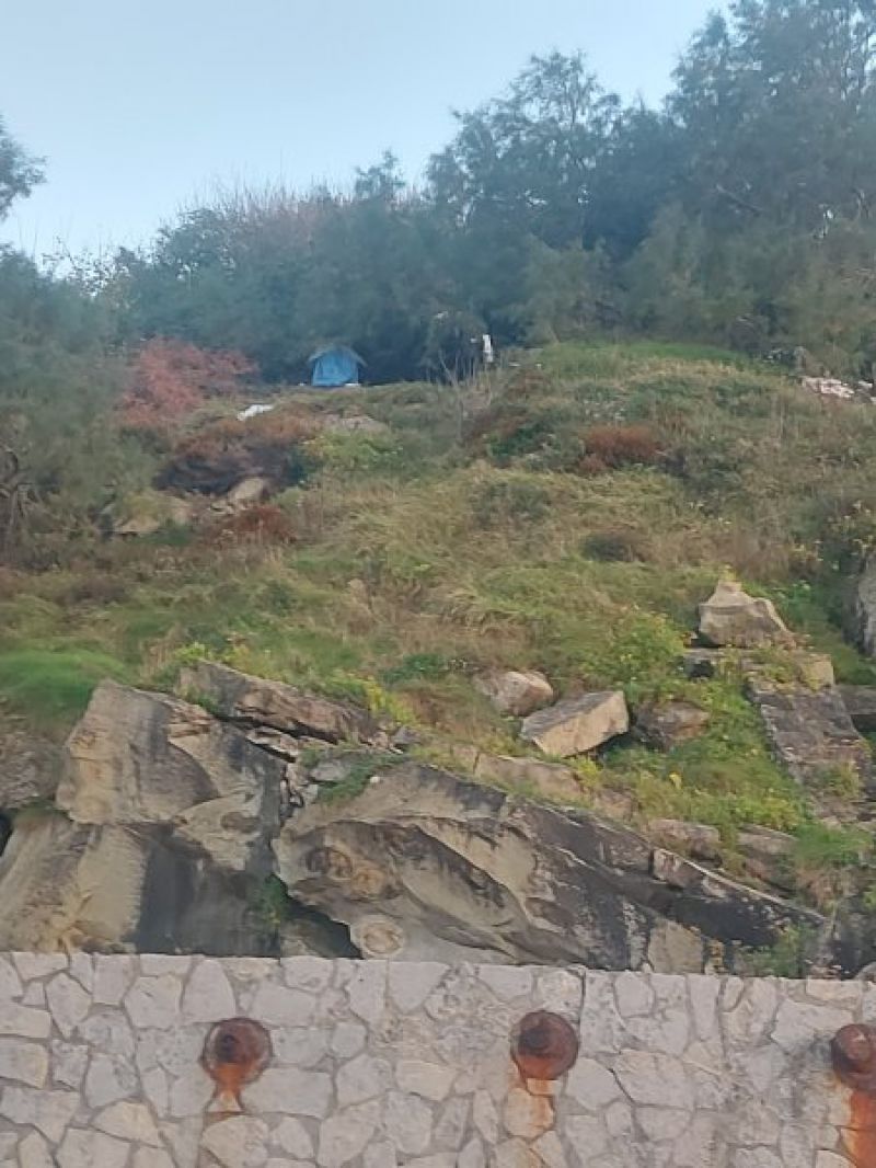 No sabia se podía vivir en el Monte Urgull.Foto tomada desde el Paseo Nuevo ayer día 12/10/2025 de una tienda de campaña.