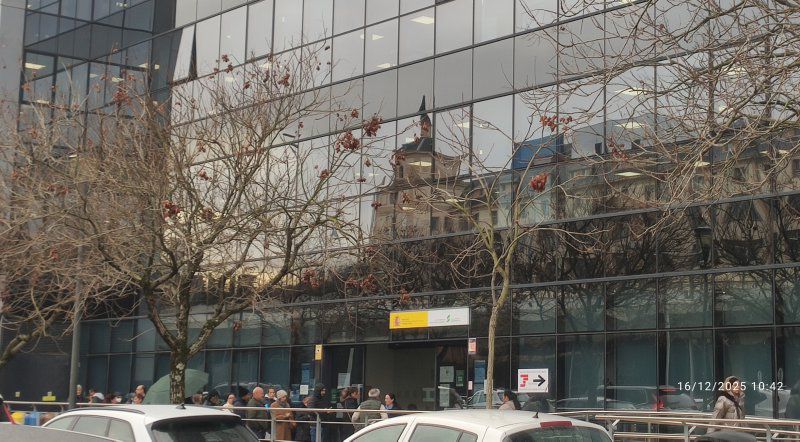 Haga frío, llueva o salga el sol, en el edificio de la Seguridad Social de Riberas de Loyola, las personas que esperan ser atendidas tienen que esperar haciendo cola en la calle, sin ninguna protección, solo la de sus paraguas en caso de lluvia,dicen que por qué no tienen "cita previa" y no caben dentro del edificio.