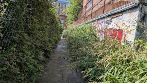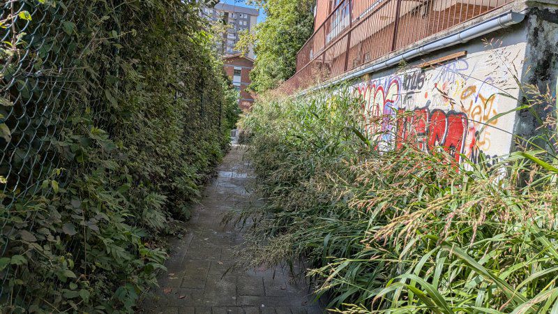 Paso peatonal de acceso de Bidebieta al ascensor de Trintxerpe. Obstaculiza invadiendo la calzada las cañas y te mojas.