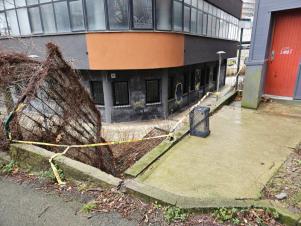 Hace meses que un temporal derribó una de las vallas que protegen de las caídas desde la calle al patio del edificio ZENTEK, en Bidebieta. Avisamos e inmediatamente vinieron a colocar una cinta. Todavía hoy seguimos esperando a que reparen o protejan de las caídas. En la foto se puede observar cómo algún vecino incluso ha repuesto la cinta (se había volado) y la ha sujetado con una caja de plástico.